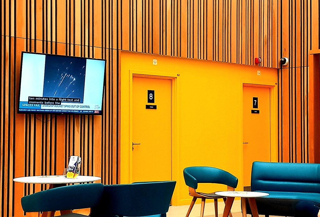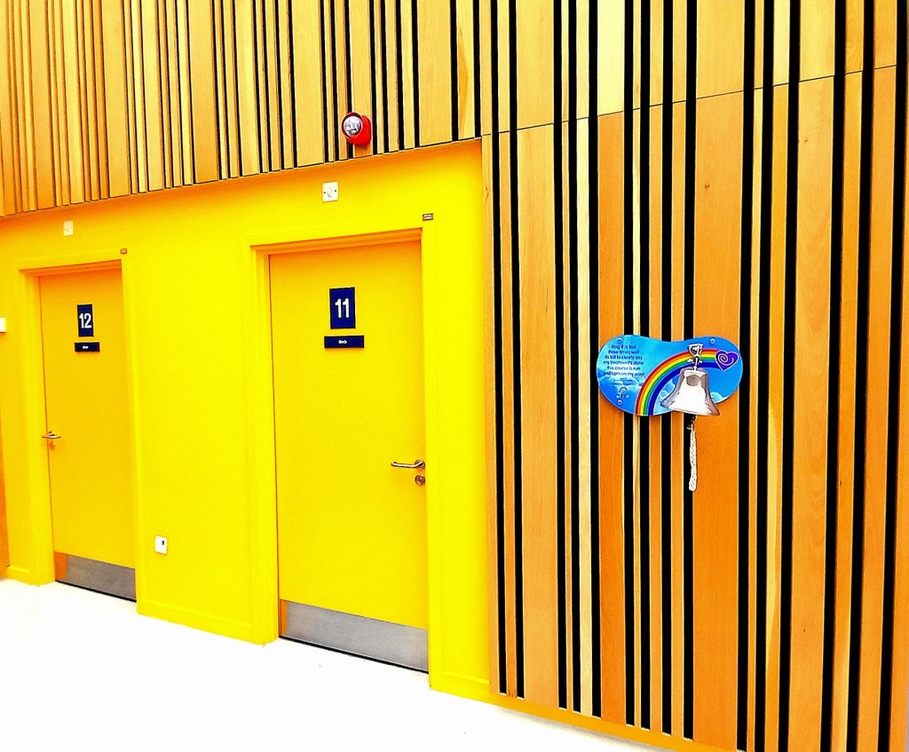 Outside of the rooms, spread sporadically, are, trendy, sofas, chairs and tables, creating a series of private, intimate clusters, within the large space. On average there will be 20 people seated (patients plus companions). The colour scheme reminds me of where I used to work, The Liverpool Institute for the Performing Arts (LIPA), which has a similar sized atrium also, bright yellow, also like Clatterbridge, punctuated with, occasional splashes of, multi, rainbow, colours.